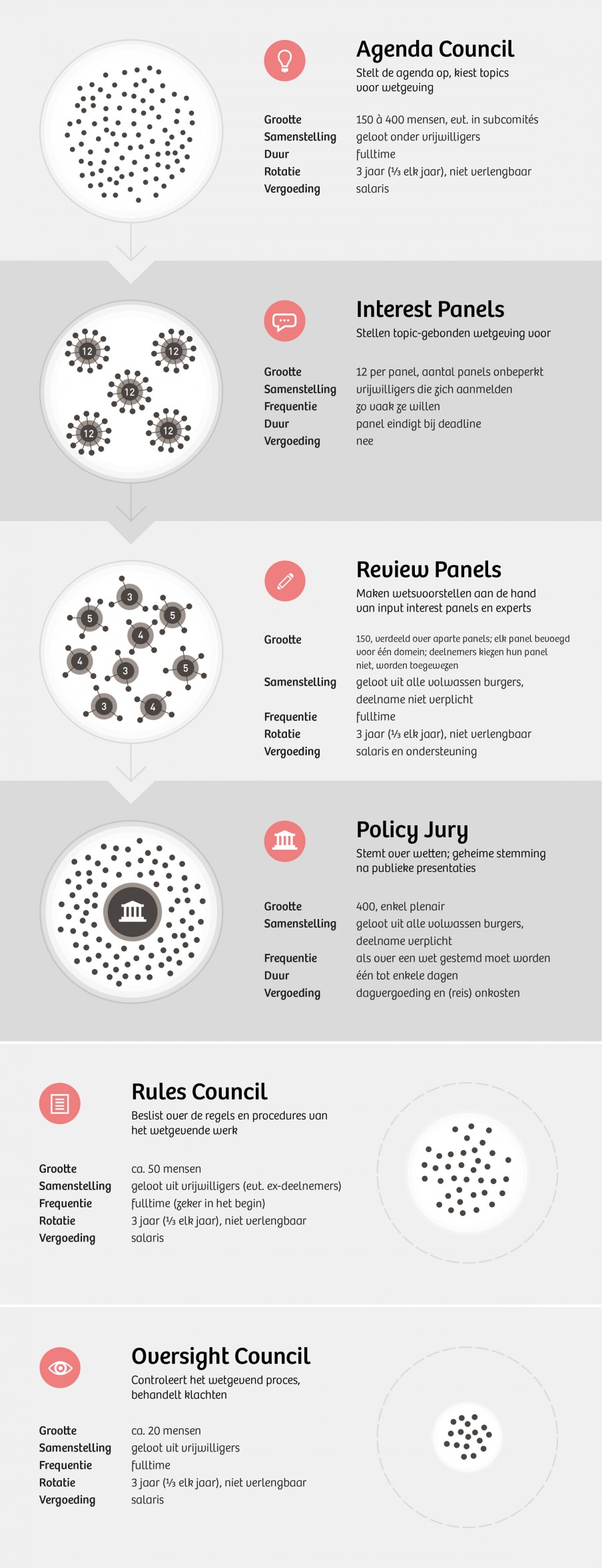 In 'Tegen Verkiezingen' voert Van Reybrouck een voorstel op van de Amerikaanse politicoloog Terill Bouricius, die een alternatief heeft uitgewerkt, waarin loting een belangrijke rol speelt. Op het eerste gezicht lijkt het een ingewikkeld plan, met 6 verschillende gelote raden die een alternatief vormen voor ons huidige systeem, en dat er zo radicaal van lijkt te verschillen dat implementatie ervan een revolutie vergt. Maar het voorstel zit wel zo goed in elkaar dat het blijft terugkeren in de gesprekken.